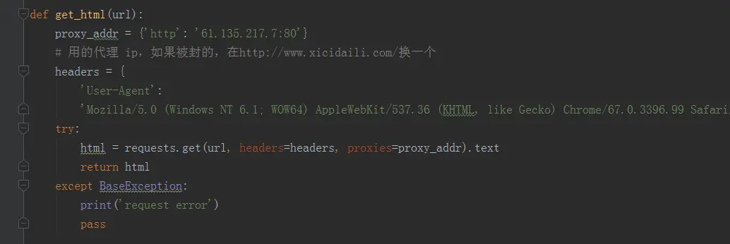 这个是爬虫第一步了,注意下代理 ip 的设置,防止自己的 ip 被封,如果爬虫数据量大的话,建议在主函数中加入等待时间,这样也不会给爬取目标的服务器增加压力,就会减少被封的风险了。
