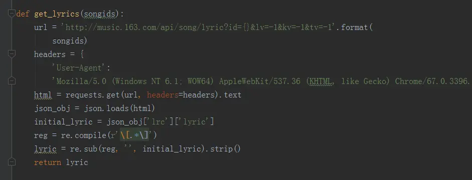 通过上个函数获取的歌曲 id 获取对应的歌词,这个地方如果直接用页面上的 url 也获取不到内容,也只能通过他们提供的 api 链接拼接上歌曲 id 即可。解析后用 json.loads() 解码 python json 格式,提取歌词信息,然后用 re.sub() 来实现字符串替换处理的功能,处理掉前面我们不需要的元素。