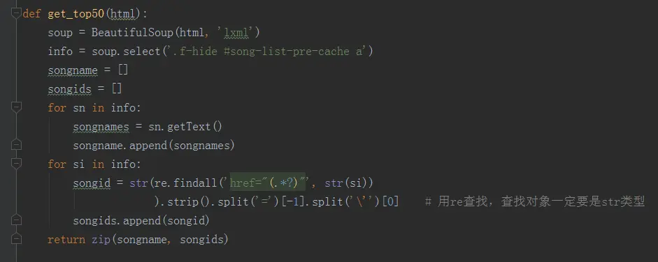 通过 get_html(url) 函数提取的源码提取出包含歌曲名称和歌曲 id,这个选择器标签藏得很深,我是把 soup 先打印出来,找出第一首歌的位置,往前查找标签,分析出选择器为 .f-hide #song-list-pre-cache a,再对提取的元素进行处理,去除不需要的信息,保留有效信息并以 zip 形式一一对应返回。