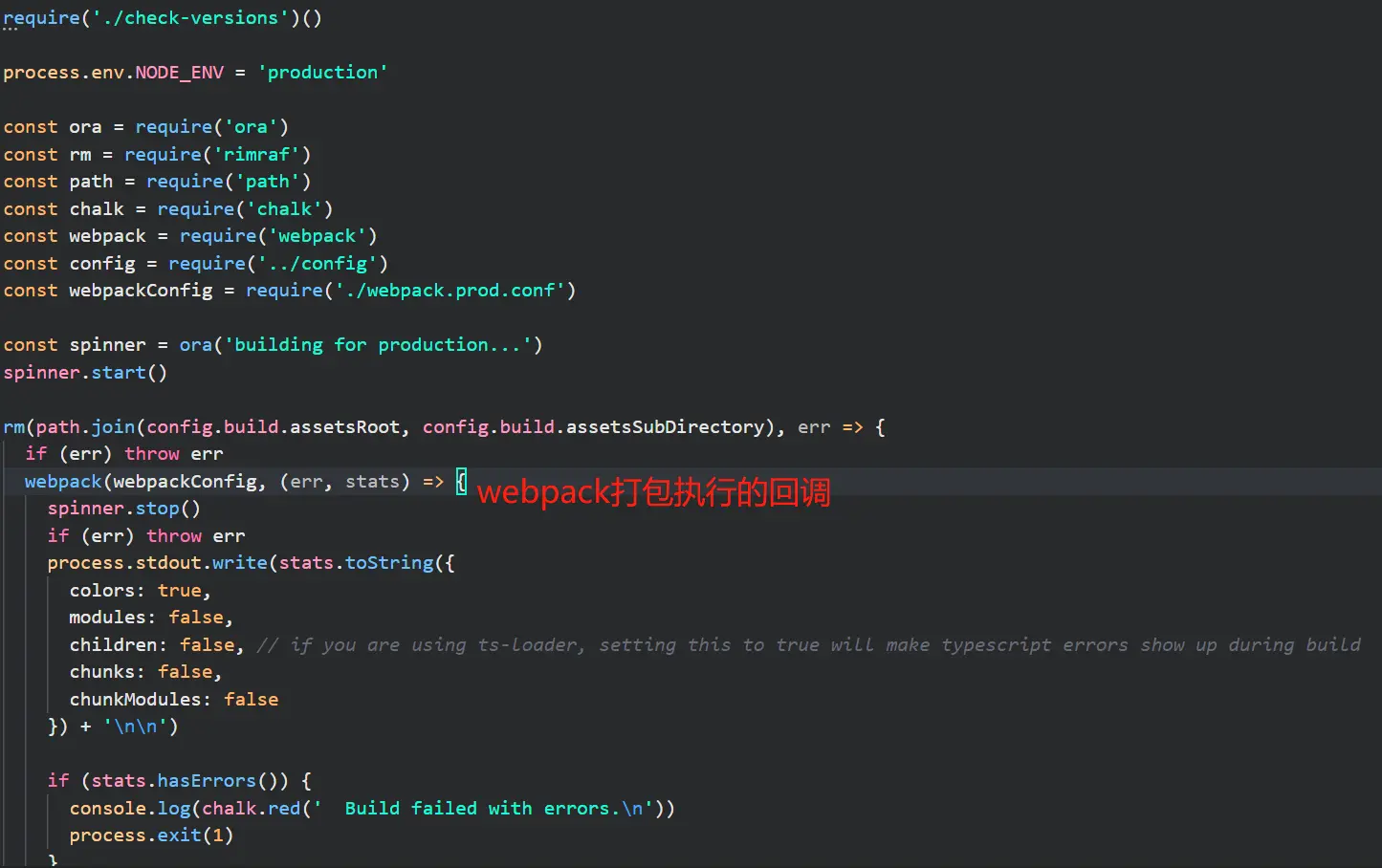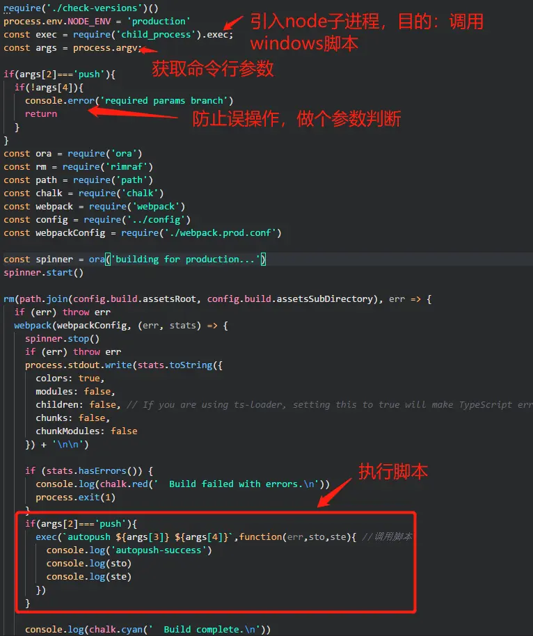 我们其实不用全部读懂build.js里面做了什么 ,我们只需要知道再build成功后在何处执行我们的脚本就可以了, 可以很清楚的看到webpack打包后的回调函数,找到位置后,我们需要引入children_process,关于这个模块这里说明两点: