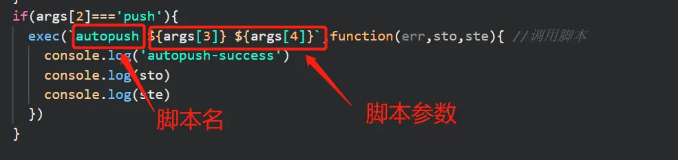 知道了这两点后,我们就可以设计我们的自定义命令了 , 因为优化的目的就是简化操作 ,所以在build的时候我们接上我们的自定义参数,这关系到后面我们的脚本编写,我设计的命令是 npm run build (push)(commit) (branch) ,这里括号包裹是为了方便表达这是一个自定义变量,实际是没有括号的,三个参数的意思如下: