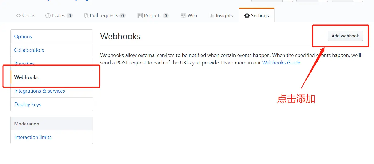 关于自动部署的文章,网上已经一大把了,在这儿为了配合这篇文章就简单介绍了自动部署的原理 , 自动部署的关键就在于webhook ,主流的代码托管平台都有这个功能,包括coding , github等,在仓库里可以设置,以github为例,大概在这个位置