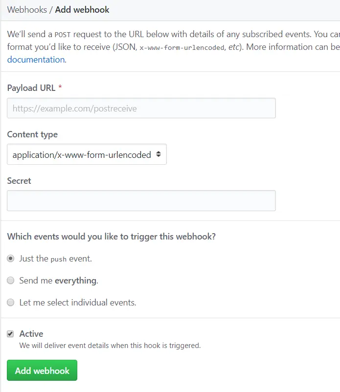 这里可以填写一个自己服务器的接口地址和一个seret用于验证 , 填写完了仓库会监听push操作 , 一旦有push操作,webhook就会发出一个post请求到你设置的接口,然后在服务器端执行脚本进行git pull操作,把最新的代码拉下来,就完成了部署。