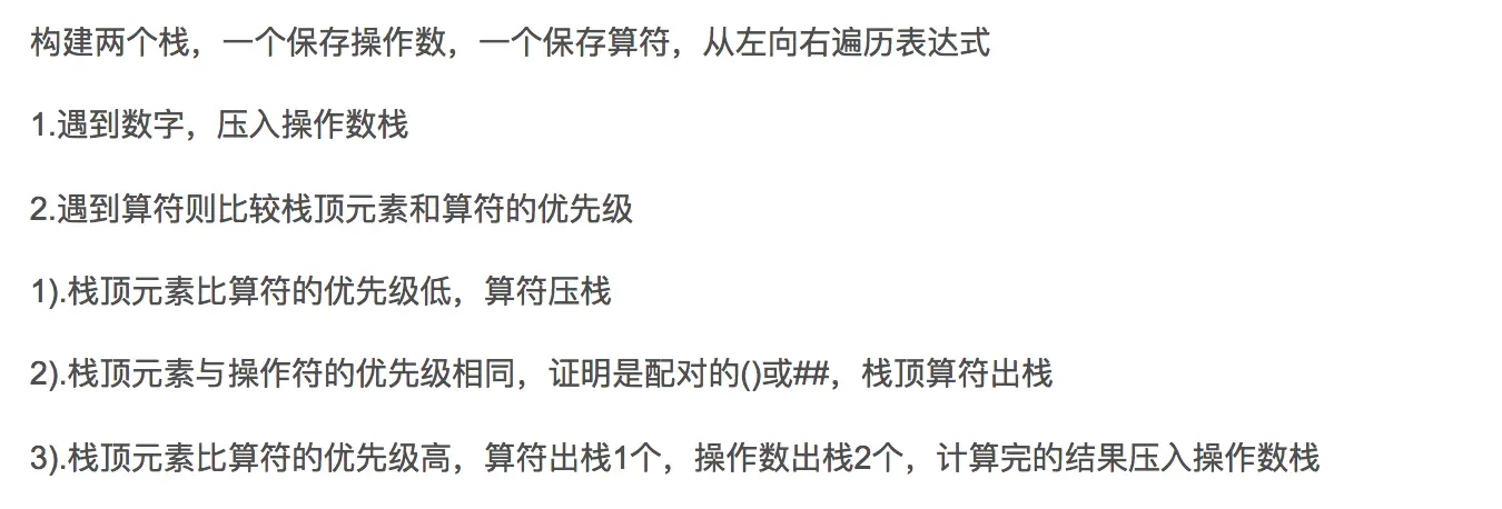 注意:如果遇到操作符栈为(+/)(从栈底 到栈顶),而待入栈的运算符为+,则需要先将/出栈,计算,然后将计算结果入栈,然后遇到相同操作符了,继续出栈,然后计算,将结果入栈,最后再将待入栈的+入栈