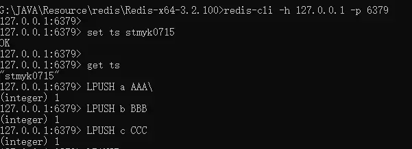 之后就启动了 Redis 的服务,之后另起一个 CMD 窗口,输入 redis-cli.exe -h 127.0.0.1 -p 6379 打开客户端,就可以在上面执行 Redis 的相关命令了。
