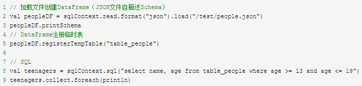 Spark SQL支持根据JSON文件自描述自动推断Schema,生成DataFrame。