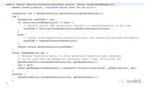Template Method模式一般是需要继承的。这里想要探讨另一种对Template Method的理解。Spring中的JdbcTemplate,在用这个类时并不想去继承这个类,因为这个类的方法太多,但是我们还是想用到JdbcTemplate已有的稳定的、公用的数据库连接,那么我们怎么办呢?我们可以把变化的东西抽出来作为一个参数传入JdbcTemplate的方法中。但是变化的东西是一段代码,而且这段代码会用到JdbcTemplate中的变量。怎么办?那我们就用回调对象吧。在这个回调对象中定义一个操纵JdbcTemplate中变量的方法,我们去实现这个方法,就把变化的东西集中到这里了。然后我们再传入这个回调对象到JdbcTemplate,从而完成了调用。这可能是Template Method不需要继承的另一种实现方式吧。