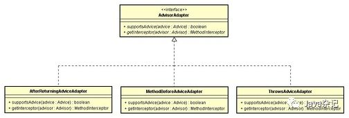 由于Advisor链需要的是MethodInterceptor(拦截器)对象,所以每一个Advisor中的Advice都要适配成对应的MethodInterceptor对象。