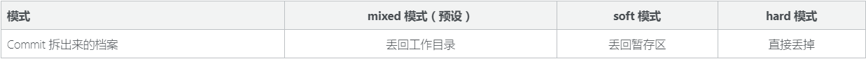 ▪git commit --amend (修改上次的commit描述信息)▪git commit --amend --no-edit (弥补一次漏交的a.py,效果等于一开始提交这份a.py,用生成的新的commit替换掉老的,没有增加tree子节点)▪/撤销▪soft 模式:这个模式下的reset,工作目录跟暂存区的档案都不会被丢掉,所以看起来就只有HEAD 的移动而已。 也因此,Commit 拆出来的档案会直接放在暂存区。▪hard 模式:在这个模式下,不管是工作目录以及暂存区的档案都会丢掉。