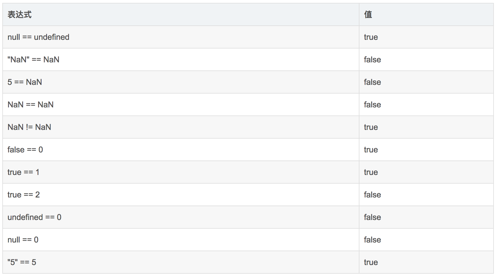 重要提示:即使两个数都是 NaN,等号仍然返回 false,因为根据规则,NaN 不等于 NaN。