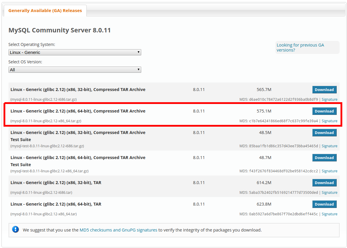 选择的是Linux 64位通用的二级制版本,这样不在需要进行编译安装,系统安装依赖库后就可以直接使用。