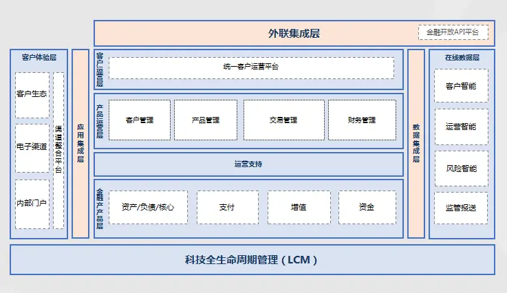 建立开放的金融服务能力,通过新一代IT系统的建设,引领金融机构从关注自身金融服务与产品的提供,转变为关注客户需求,实现为客户提供个性化金融业务解决方案的能力,打造金融服务生态圈。进一步,将信息科技与业务能力输出,基于金融机构的整体架构为客户打造客户的商业平台,让客户具备完整的业务运营能力,构建起基于金融服务的商业生态圈,实现金融机构核心价值。