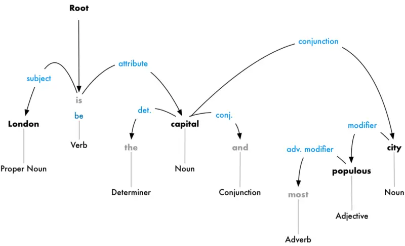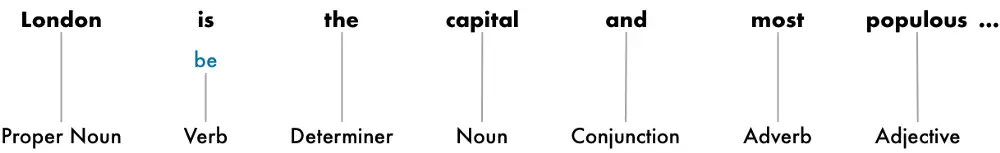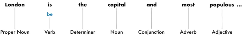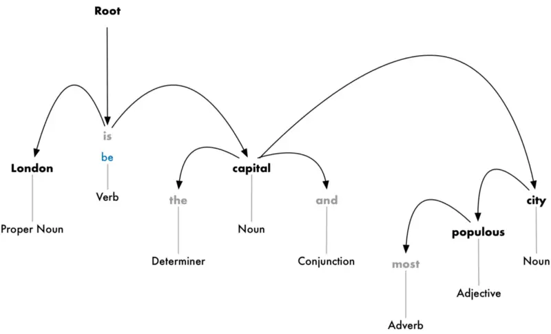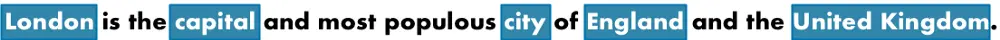 根据这些信息,我们已经能够开始搜集一些非常基础的含义。比如,这个句子中的名词包括“伦敦”和“首都”,所以这个句子极有可能是与伦敦有关的。