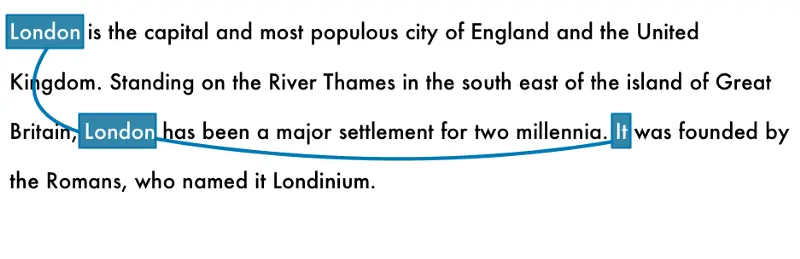 当人们读这个句子时,能够很容易得出“它”代表“伦敦”。共指解析的目的是根据整个句子中的代词来找出这种相同的映射。我们是想要找出所有指向同一实体的词语。