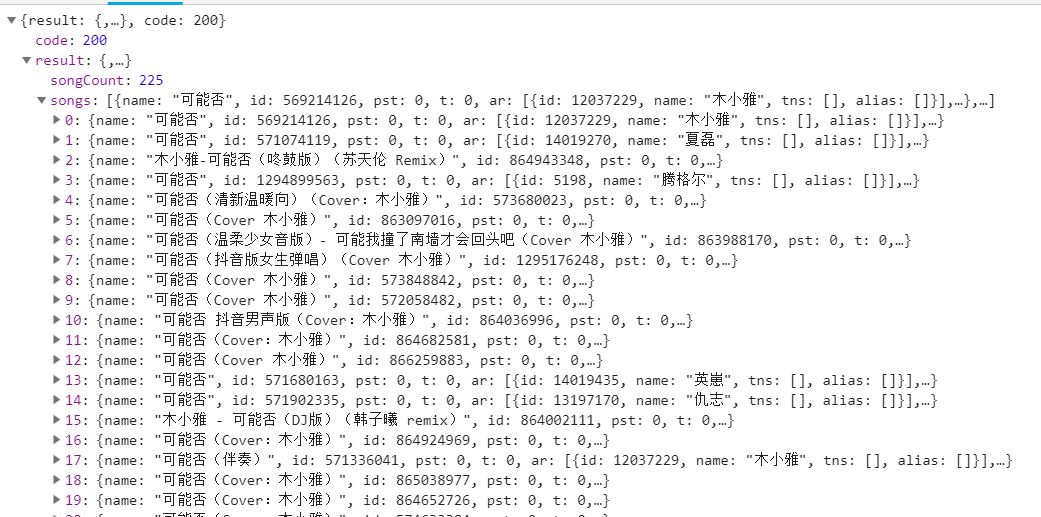 这个链接返回的是json,里面包含的是歌曲的信息,但是没有MP3播放链接,这个或许有用,因为有歌曲的id,先放着。
