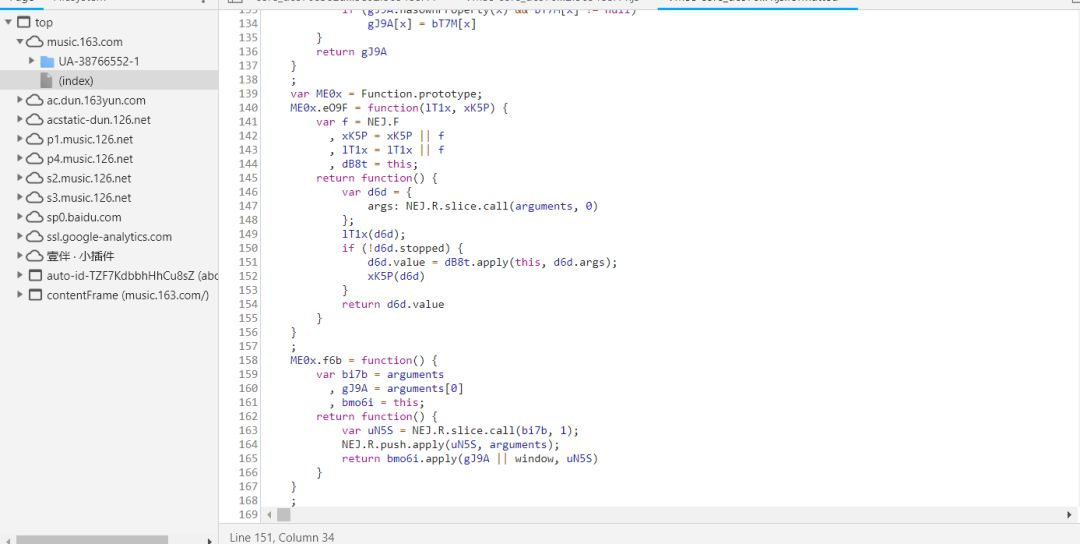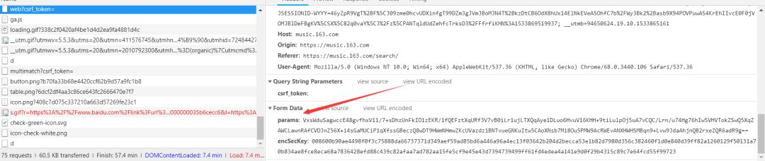 是两个加密了的参数,不过不怕,如果你看过我之前写的利用python爬取网易云音乐,并把数据存入mysql你会发现fromdata参数是一样的,所以破解加密参数思路是一样的,不过这次我不用fiddler了,只用开发者工具来调试,看好了!!!我们看看这个请求的来源是什么。