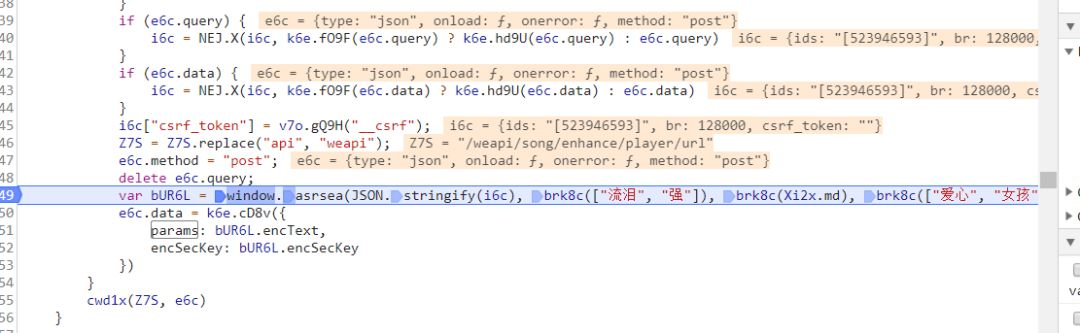 可以看到**window.asrsea()**是一个d函数,定位过去看看,然后又给个断点。