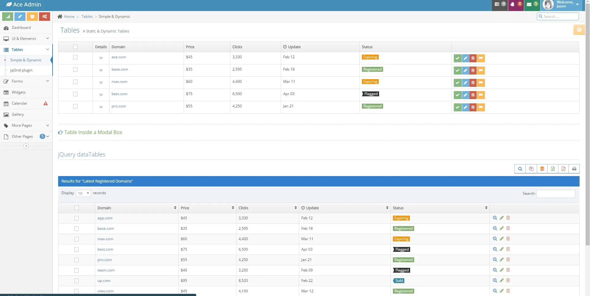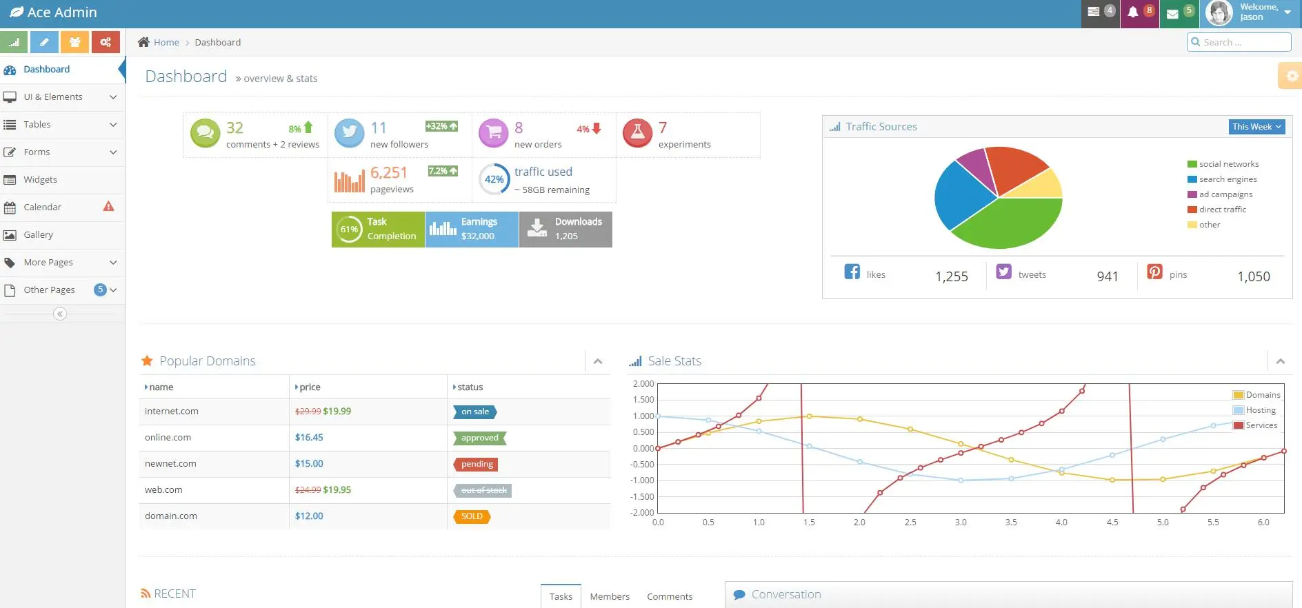 响应式Bootstrap网站后台管理系统模板ace admin,非常不错的轻量级易用的admin后台管理系统,基于Bootstrap3,拥有强大的功能组件以及UI组件,基本能满足后台管理系统的需求,而且能根据不同设备适配显示,而且还有四个主题可以切换。官方地址:http://ace.jeka.by/