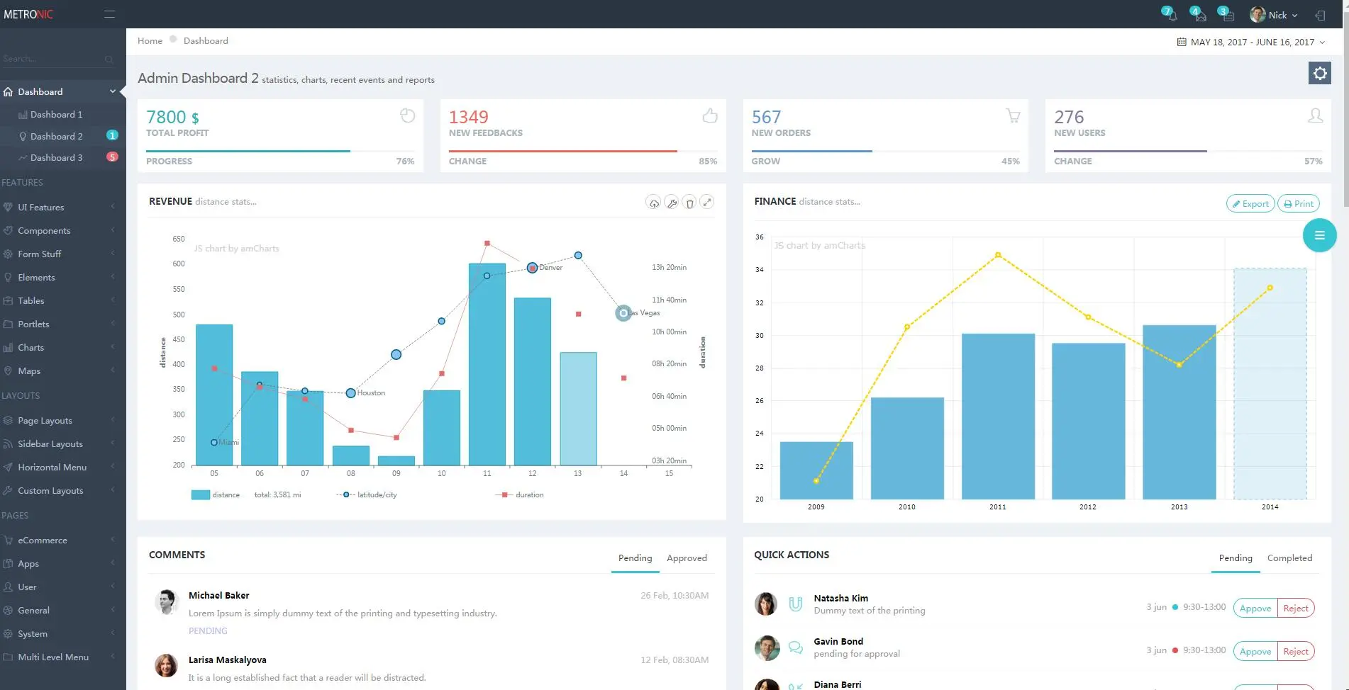 Metronic 是一套精美的响应式后台管理模板,基于强大的 Twitter Bootstrap 框架实现。Metronic 拥有简洁优雅的 Metro UI 风格界面,6 种颜色可选,76 个模板页面,包括图表、表格、地图、消息中心、监控面板等后台管理项目所需的各种组件。官方地址:http://www.metronic.com/