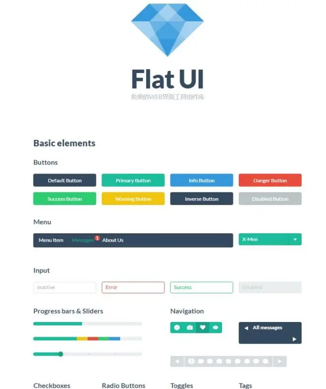 Flat UI是一套精美的扁平风格 UI 工具包,基于 Twitter Bootstrap 实现。这套界面工具包含许多基本的和复杂的 UI 部件,例如按钮,输入框,组合按钮,复选框,单选按钮,标签,菜单,进度条和滑块,导航元素等等。官方网址:http://www.bootcss.com/p/flat-ui/