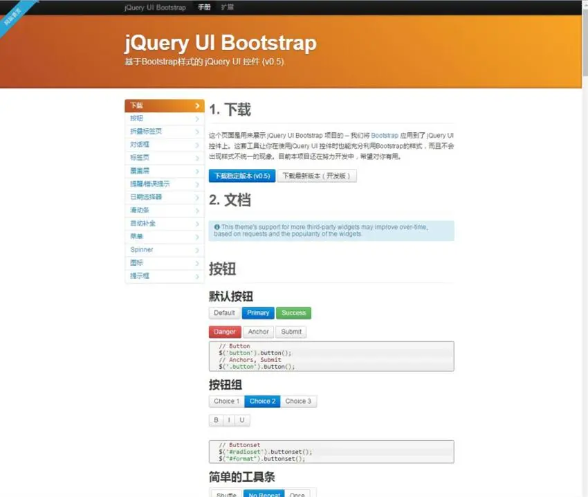 jQuery UI Bootstrap 是一个jQuery UI主题。它受到Twitter项目的启发,将其slickness引入jQuery UI Widgets中。它是jQuery UI和Bootstrap的集成,它是Bootstrap样式的,因此外观比较漂亮,同时它拥有jQuery UI的控件功能,这也方便开发者快速地创建一个网页控件。官方网站:https://github.com/jquery-ui-bootstrap/jquery-ui-bootstrap/