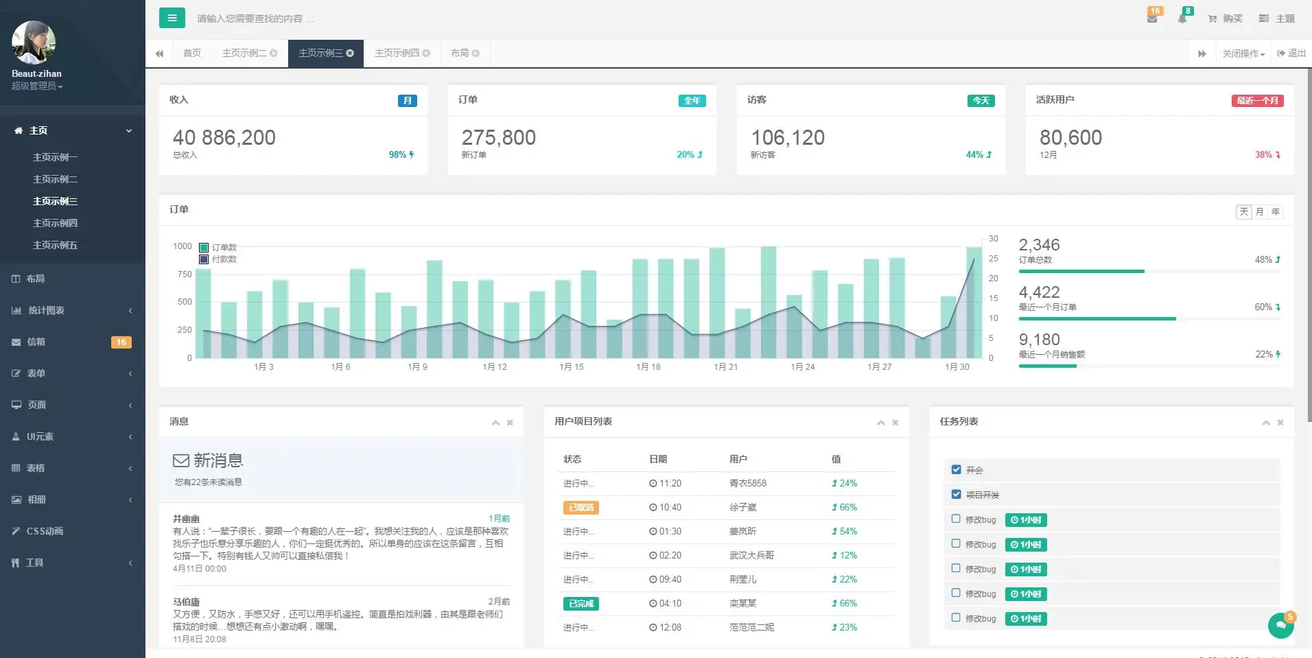官网的介绍:H+是一个完全响应式,基于Bootstrap3.3.6最新版本开发的扁平化主题,她采用了主流的左右两栏式布局,使用了Html5+CSS3等现代技术,她提供了诸多的强大的可以重新组合的UI组件,并集成了最新的jQuery版本(v2.1.4),当然,也集成了很多功能强大,用途广泛的jQuery插件,她可以用于所有的Web应用程序,如网站管理后台,网站会员中心,CMS,CRM,OA等等,当然,您也可以对她进行深度定制,以做出更强系统。官网:http://www.zi-han.net/theme/hplus/