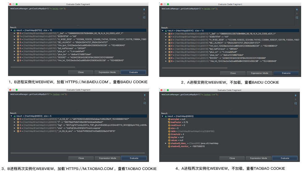 1、A进程未初始化CookieManager的情况下,使用进程B访问https://m.baidu.com,Cookie持久化后,然后分别在初始化A进程的CookieManager前后,查看A进程的Cookie情况;接着再使用进程B访问https://m.taobao.com,Cookie持久化后,再次查看A进程的Cookie情况。