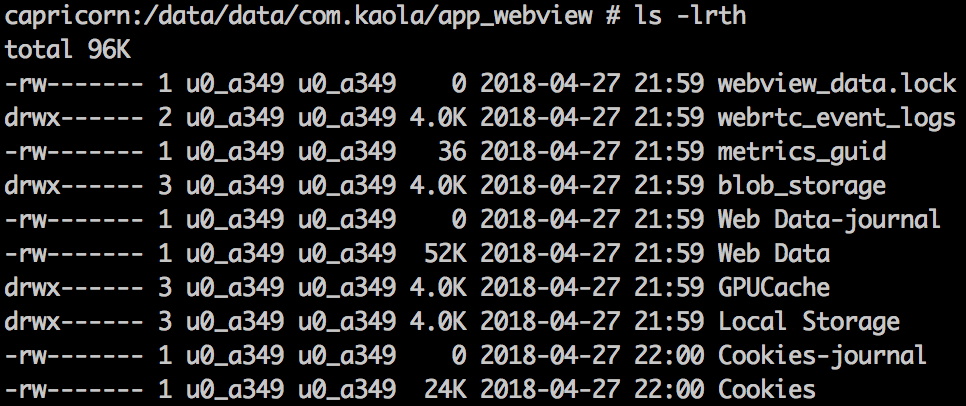 此时再次访问上述目录,可以发现app_webview目录已经存在了,并且生成了Cookie文件。说明在第一次打开WebView加载完https://m.baidu.com的时候就已经生成了Cookie并且持久化,