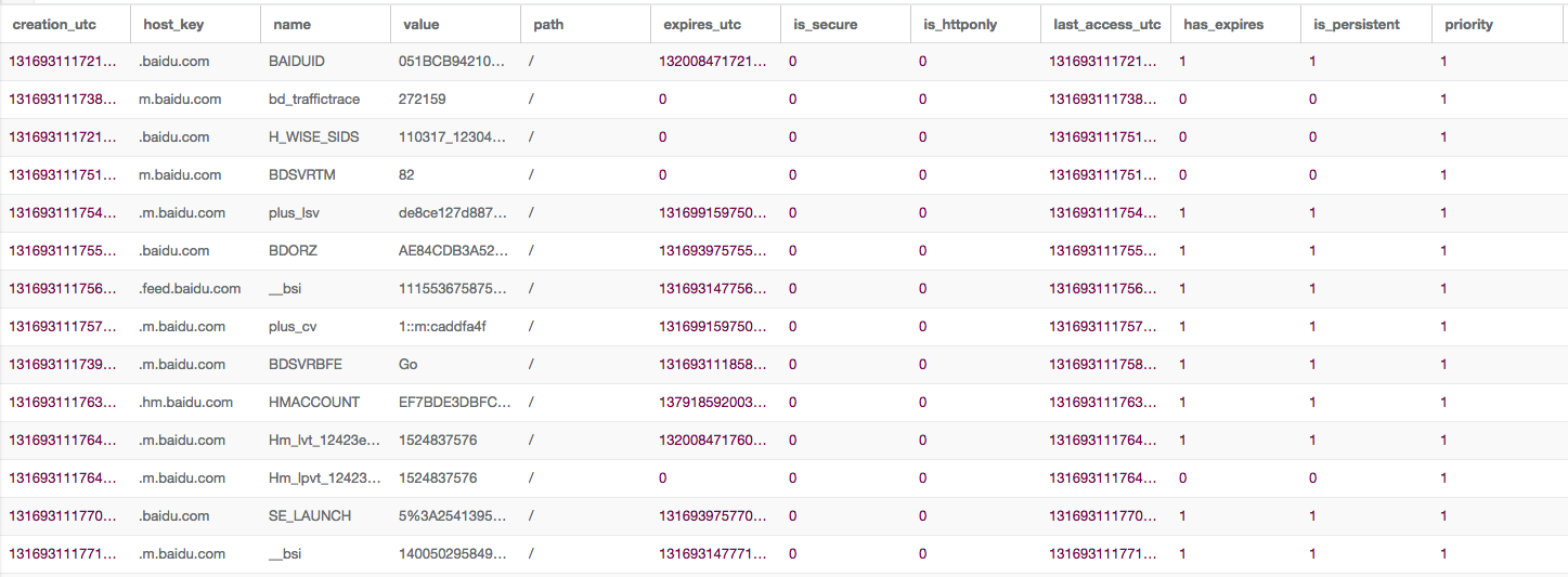 从图中可以看到,B进程访问url后的Cookie和A进程访问url后的Cookie数据几乎是一致的,只有一列不一样——last_access_utc。我们猜测这个字段表示上一次成功读取/写入该Cookie的时间(没有找到相关的文档介绍),但至少说明Cookies这个文件发生了覆盖,也就是说,App里的不同进程对同一个域访问,可能会造成Cookie覆盖。