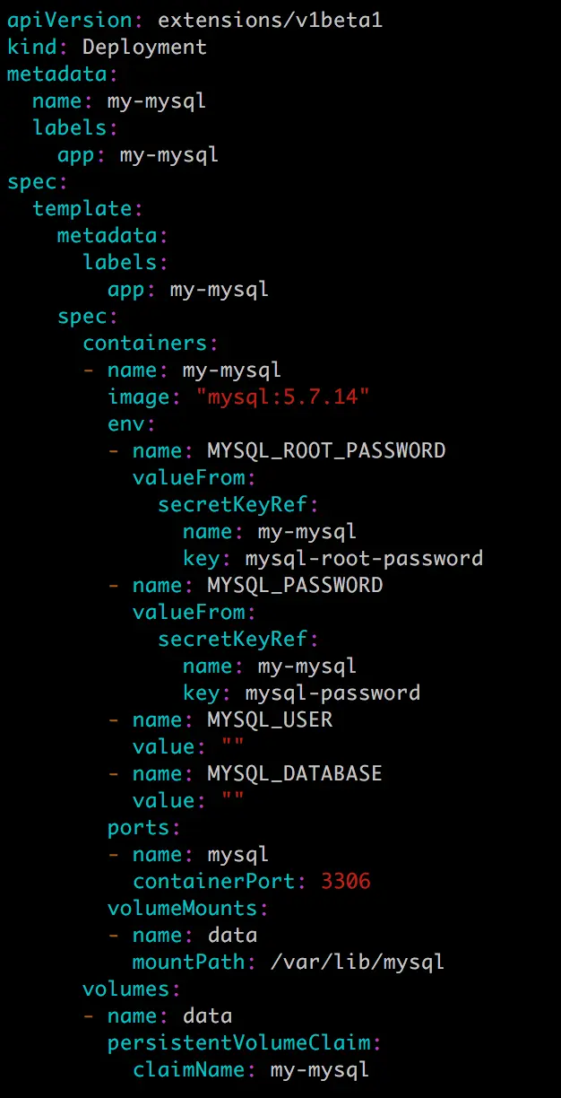Deployment,部署 MySQL Pod,并使用上面的这些支持对象。