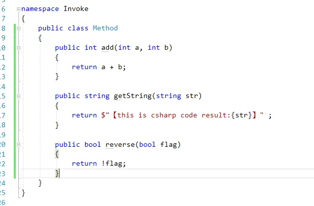 然后新建需要被调用的CSharp类代码。这里我们新建一些简单的方法,为了演示效果我们分别对int、string、bool进行操作。如图: