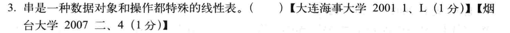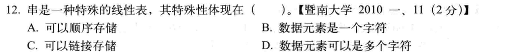 串是一种特殊的线性表,其特殊性体现在:数据元素是一个字符