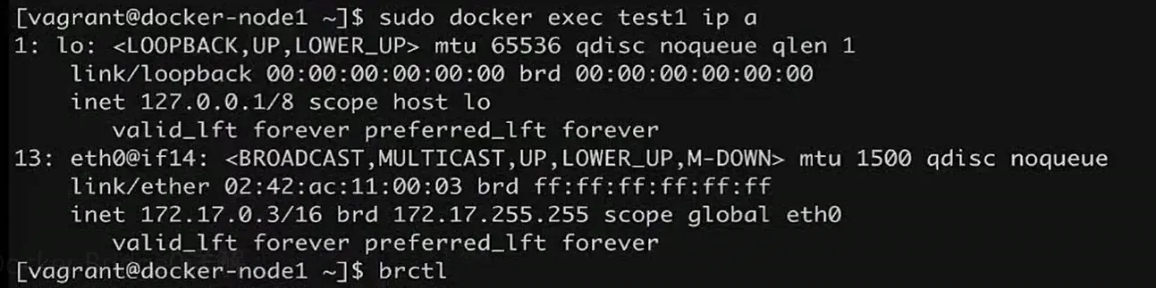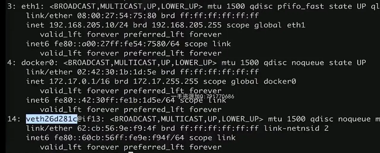 docker exec test1 ip a 进入查看dokcer容器test1的ip network,其中eth0@if14和veth26d281@if13是一对,往下看