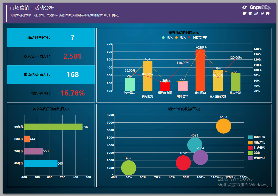 市场营销数据主要在于数据分析,数据发展趋势预测,可视化图表的要求会较高,所以在选择报表工具时需要支持Dashboard 管理看板报表,以及常用的各种图表。ActiveReports 报表控件支持 30 多种(2D 和3D 效果)图表类型,包括各类复合图表,多Y轴图表,交互式图表,散点图,甘特图。