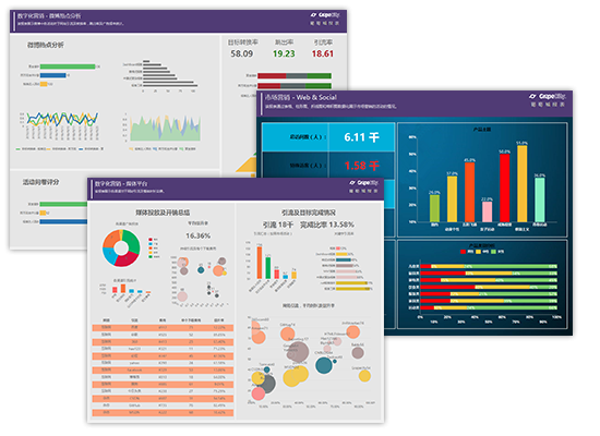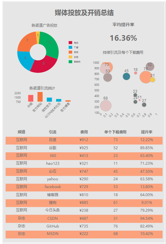 市场营销数据往往会比较大而且是多渠道的,我们需要同时监控多个渠道的流量数据趋势以及对比,所以在市场营销报表中,使用的柱形图,折线图,饼状图,气泡图等图表用于从不同维度来表示市场数据。