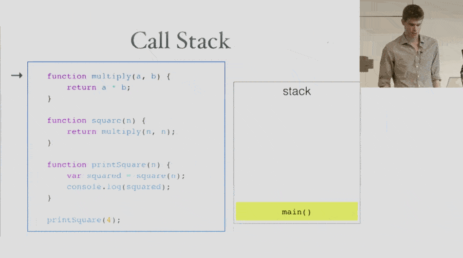栈的特点:先进后出(First in, last out,具体是怎样让那些函数先入后出的?看下图会恍然大明白,图中的帅哥是Philip Roberts,看解释,别光看脸!