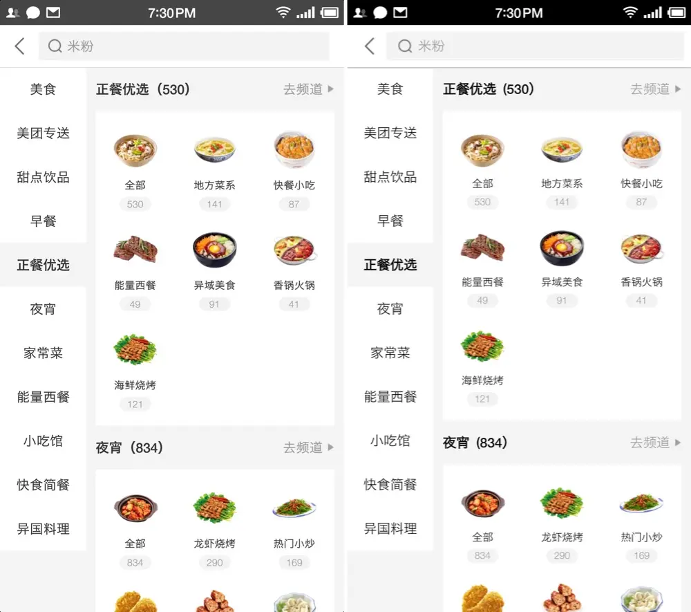 虽然使用原生实现(左)和Flutter实现(右)的全品类页面在实际使用过程中几乎分辨不出来: