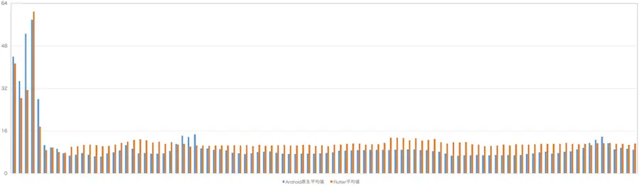 Android原生实现和Flutter版本都会在页面打开的前5帧超过16ms,刚打开页面时原生实现需要创建大量View,Flutter也需要创建大量Widget,后续帧中可以重用大部分控件和渲染节点(原生的RenderNode和Flutter的RenderObject),所以启动时的布局和渲染操作都是最耗时的。