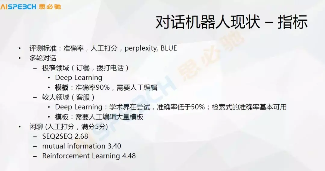 在一些极窄的领域里,比如说订餐,甚至更窄一点,比如订一个披萨或者订咖啡,或者拨打电话,这种很窄的领域,实际上现在机器学习的方法和模板的方法都能够做到一个比较好的精度。