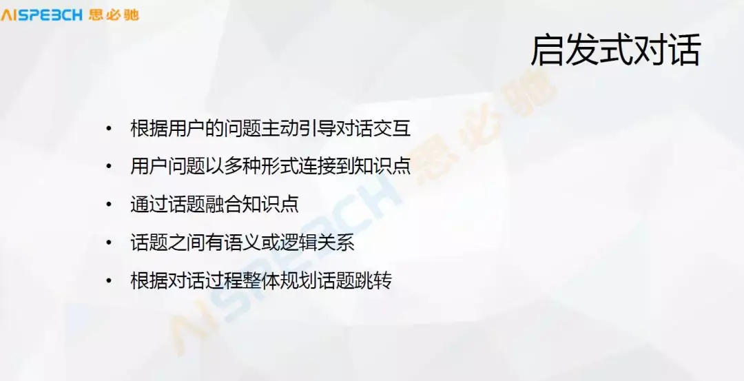 我们来看一下启发式对话有哪些基本的特点,首先根据用户的问题主动引导对话交互,用户问了一个问题,系统会根据这个问题把一些相关的问题列出来或者问用户他想不想了解。用户的问题是以多种形式连接到知识点,当然这个对话后面,我们叫知识点,以一个知识点的方式,连接一个知识点可能就是对于一个具体的问题,这个问题可能有各种不同的问法,我们都认为它是一个知识点。