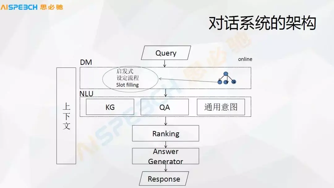 当然这里边,边上还有一个模块就是上下文的管理,它在对话管理、NLU 以及排序和答案生成这些模块里都会用多,它会维护一些上下文的信息。当然这张图结构是比较简单的,但是每一个里边实际上有挺多东西,我们后面看具体的内容,最后我们回过头再来看这张图,可能就会有一些不一样的东西。