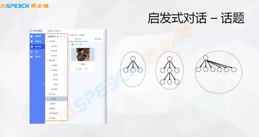 这是一个具体的例子,这是一个产品的形态,就是说这个话题的组织。对于一个企业的客户,它如果想做一个它的对话系统,它可以人为地去设定一些话题,这个话题是以树型的组织,比如在这个里边就是一个关于花相关的话题,比如怎么学习花艺,各种花艺相关的信息,每一个话题,橙色的这部分是这个话题的组织,话题树,用户可以设定这样一个话题的组织。在这个话题下面,每一个话题下面用户都可以去定一些,比如花艺大师,花艺大师下面用户可以定义它在这下面一些人相关的信息,然后具体把这些人相关的信息列出来。