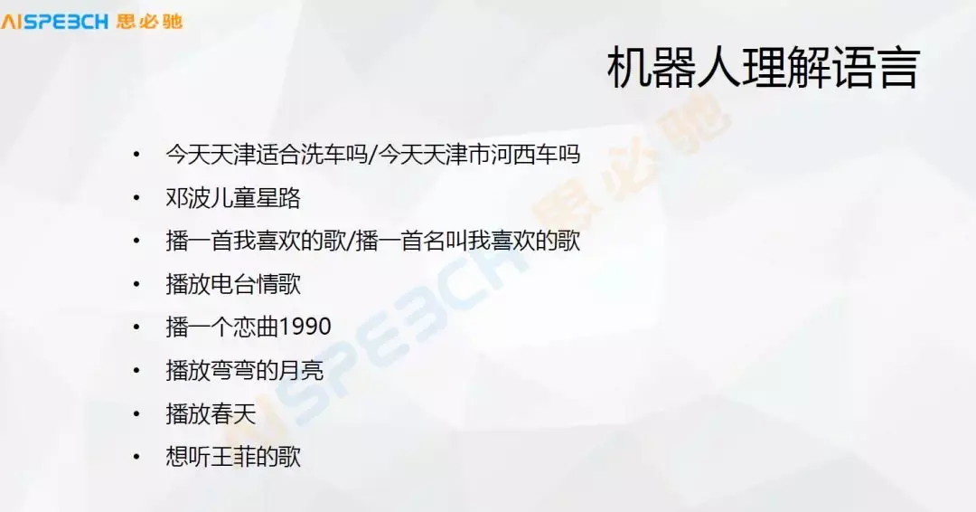 首先来看几个例子,在机器人理解语言中可能遇到的一些问题,这个给大家一个直观的感觉,可能遇到哪些问题。比如说在理解上,机器人理解语言的过程中,比如说“今天天津适合洗车吗”这样一个输入,如果是语音或者拼音输入都可能会有这样的问题,“今天天津适合洗车吗”可能和“今天天津市河西”,天津市有一个河西区,可能就会理解错,从拼音到文字可能就会出错,实际上这个非常相似的。