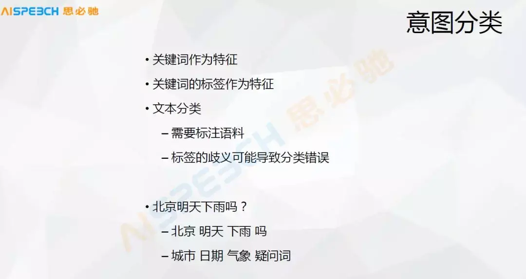 另外一种可能就是通过意图的分类的方式,比如通过一些机器学习的方式给它做一个分类。比如我们做一点简单的,比如天气,对话系统只要理解出来它是天气,然后我们就给它播一个天气预报,很多场景下用户也可以接受,系统不理解它里边具体的东西,只理解是某一种意图,然后就给它做一个播报。这里面常见的这种分类的算法都可以用得到。
