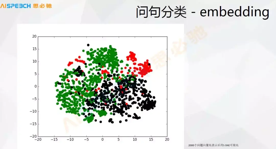 问句分类也有一些直接拿现在深度学习的,比如embedding,实际现在深度学习,比如前面提到的 Sequence to sequence 模型可以直接把用户的问题 embedding 成一个向量,我们直接拿这个向量实际上就可以做一些问句的分类或者相似度计算,这张图是大概 2000 多个用户的问题,然后做了一个 embedding,就是用 Sequence to sequence 做了一个 embedding。