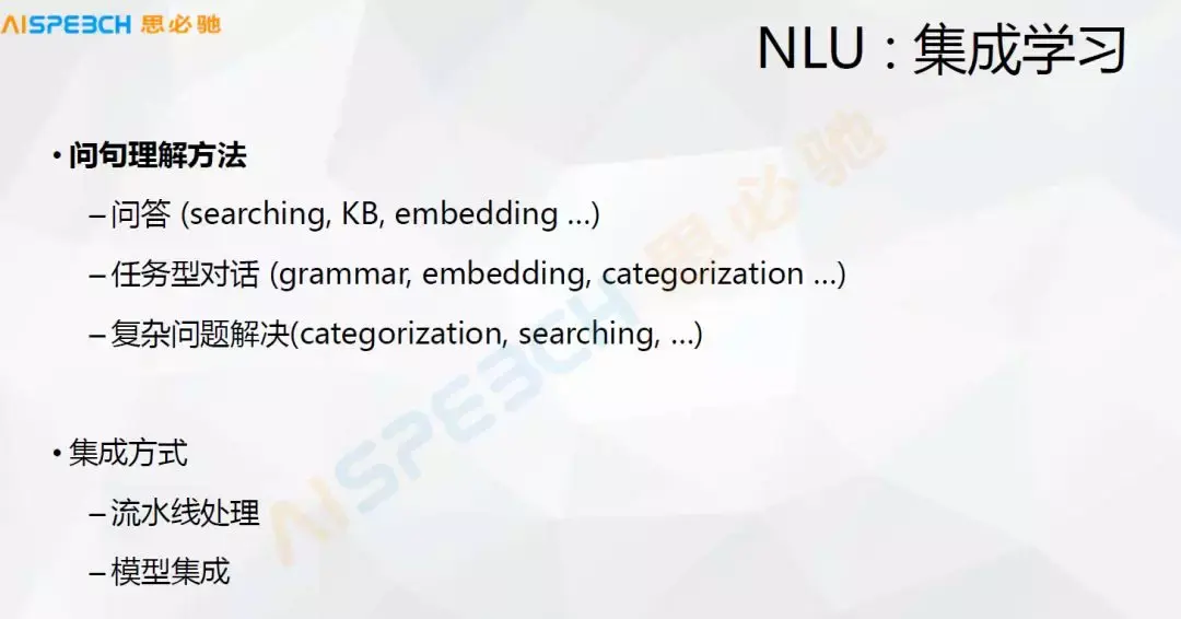 刚才介绍了现在理解方面主要的方法,但是现在也有很多方式是说集成,我集成上面各种方法,然后做一个集成学习,比如问句理解的方法,问答的方式,就是检索、知识图谱、 embedding 的,都可以用来做问答,任务型的问答可能有规则的,也可以做embedding,也可以做分类,复杂问题可能就是客服里边有很多问题其实挺复杂,长度也比较长,可以用这种分类或者检索的,也可以用更严格的语意解析的方式来做。这些不同的方式、算法做一个集成,实际上现在有挺多是这样做的,效果也还是挺好。