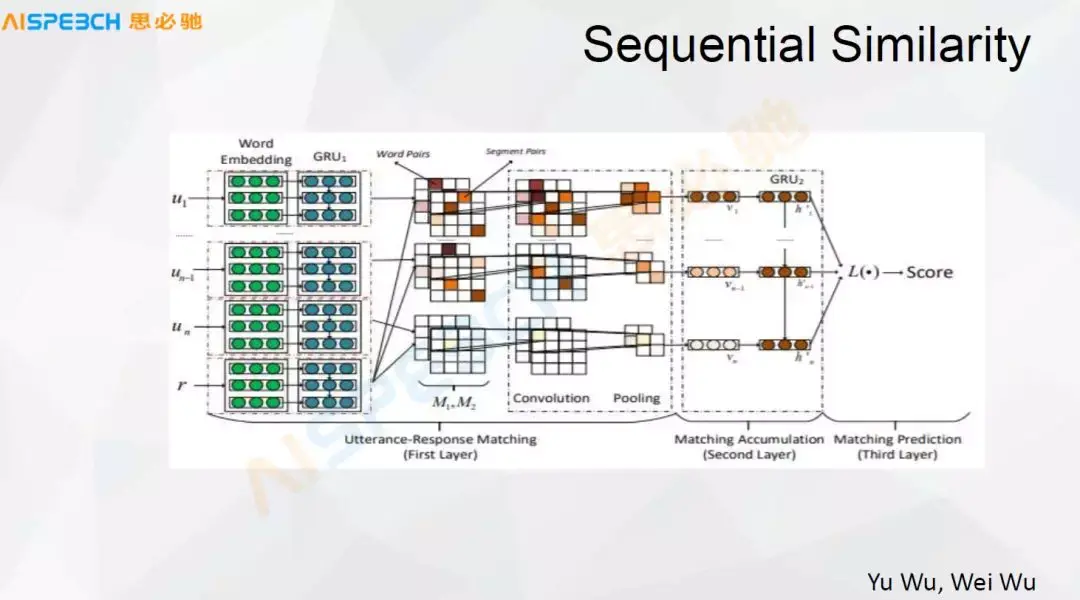 我们看一下下面这篇文章,这篇文章我觉得是在做相似度计算方面比较经典的一篇文章,它还做得比较好。它左边是输入,比如有 u_1、u_n-1、u_n是用户的输入,u_1 到 u_n 是用户输入的整个上下文,他可能说了多句。r是response响应。