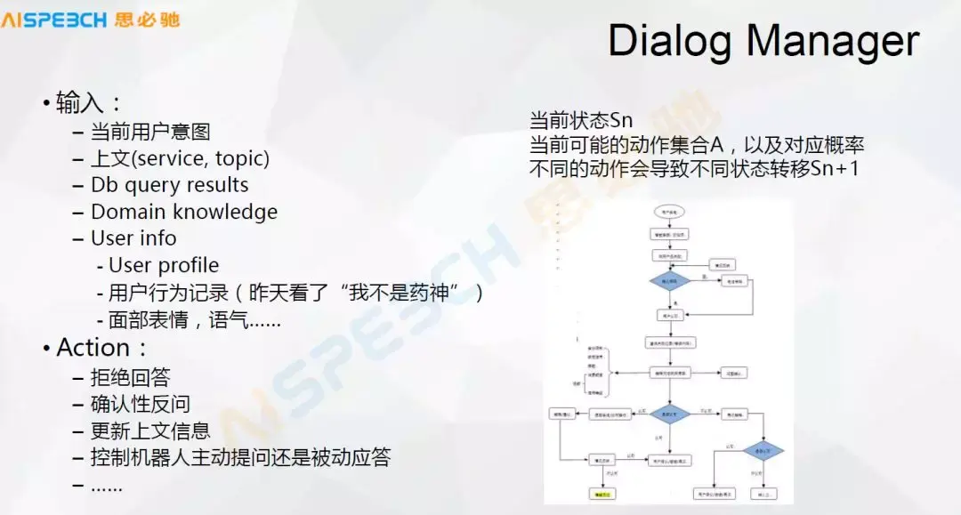 对话管理一般是这样,我们在有上下文的情况下,对话管理就是用户当前我们可能能分析出来一个意图,有的时候甚至当前我们都分析不出来一个意图。比如说用户说了一个上海,我们实际上不知道用户说上海是什么意思,如果前面是在说天气,那上海就是跟天气有关,如果前面在说订票,那上海就是和订票有关。有当前的一个用户的意图,甚至这个都不是一个意图,然后有上文,有一些上文是在哪个领域里边,有用户的信息,这个有时候可能还有一些用户长时间的信息,根据这些信息做出一些行为,到底是要答复,还是拒绝,还是去问用户的补充,用户需要补充一些信息。