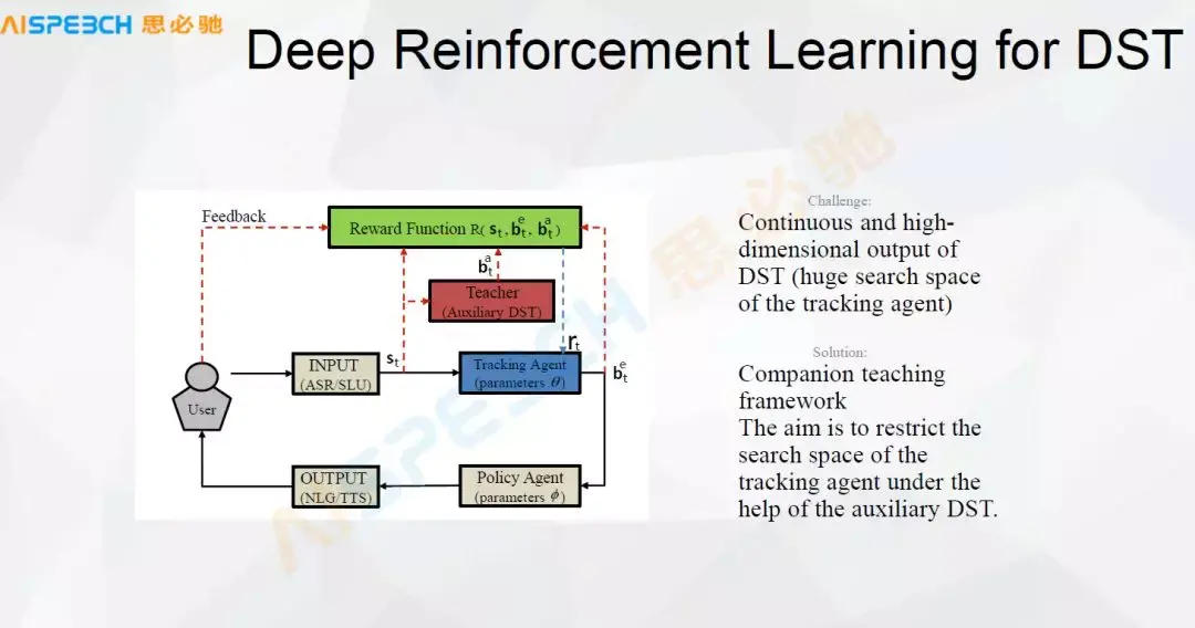 这是一个用深度强化学习来做对话状态跟踪的简单状态,比如用户输入了一句话,通过语音识别,它可以有一个状态的管理,然后去管理这个状态,通过一个策略来控制它的输出。当然它中间核心的一个部分是有这个 Reward 函数,在对话里,这个 Reward 函数就非常重要,一般情况下它也不太好定义,因为我们对话,它到底什么算合适,什么算不合适,这个还不是特别好控制的。