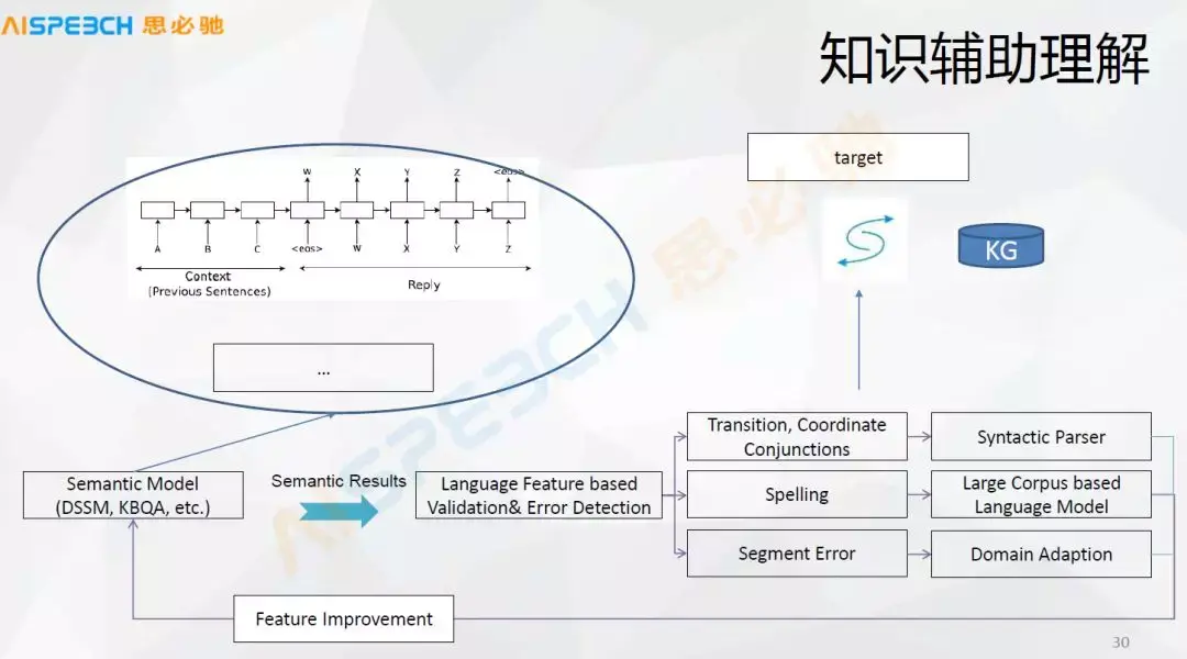知识在这里边分为两种,一种是知识图谱,严格的知识图谱,这里边 KG 的这部分。另外一些是语言的知识,比如说语言的搭配、语言语法的转换、拼写的问题、领域的问题,实际上还包括一些领域词的问题,相似词、同义词,这些东西在自然语言发展,这么多年实际上已经积累了很多这方面的知识,但是这些东西在现在深度学习里边实际上很难结合进去。